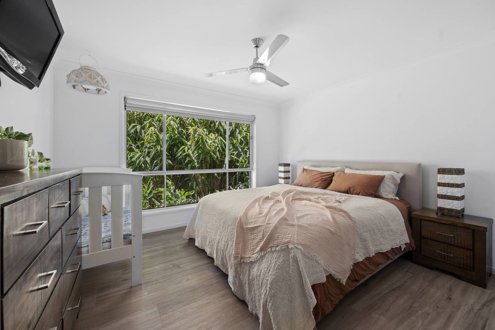 Relax and unwind in the generous master bedroom as you enjoy views of the lush tropical garden from your bed ,