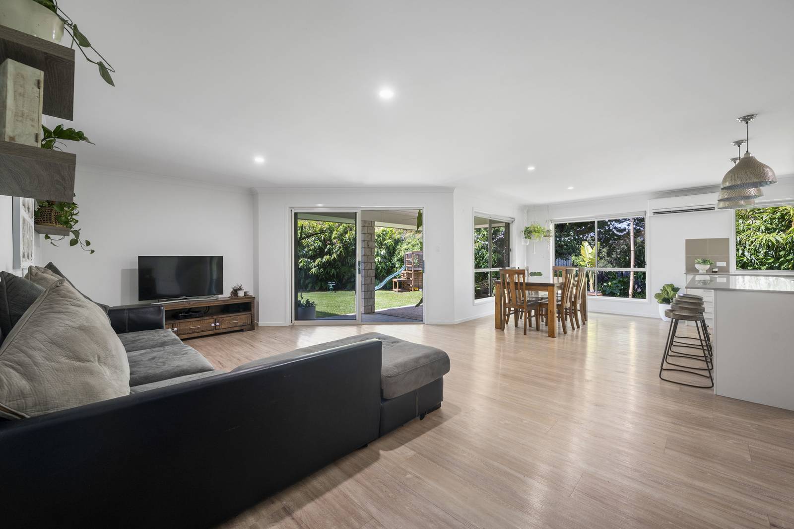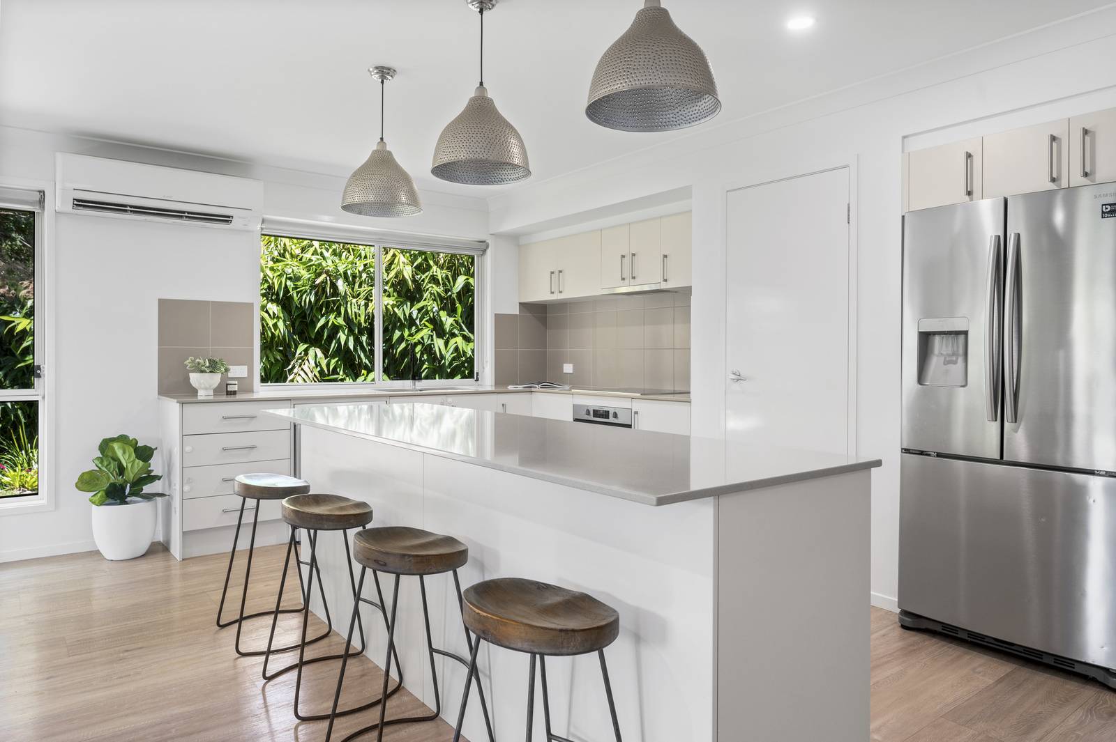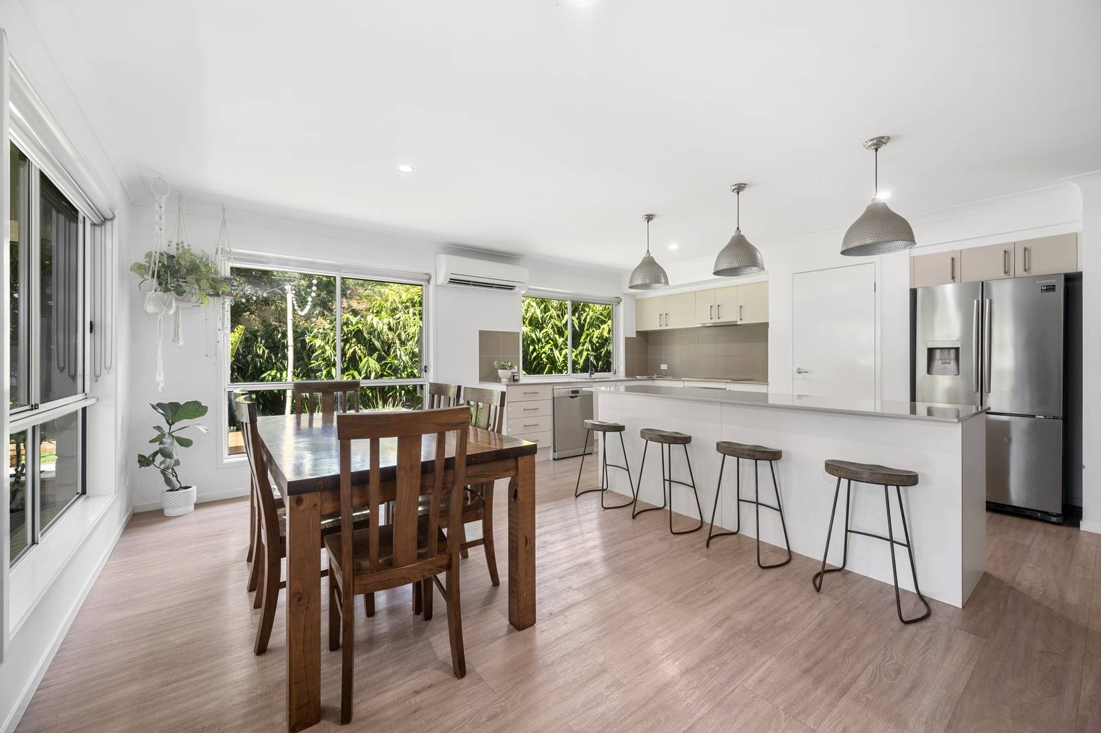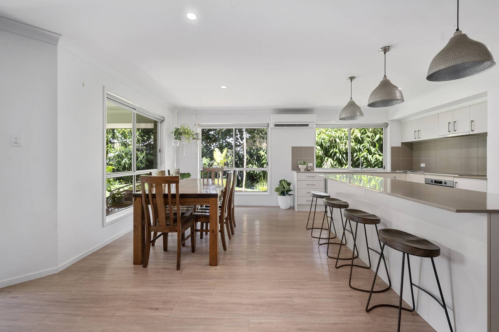 that is ideal for the chef of the home. This area includes reverse cycle air conditioning and stunning pendant lights overhanging the large island bench.