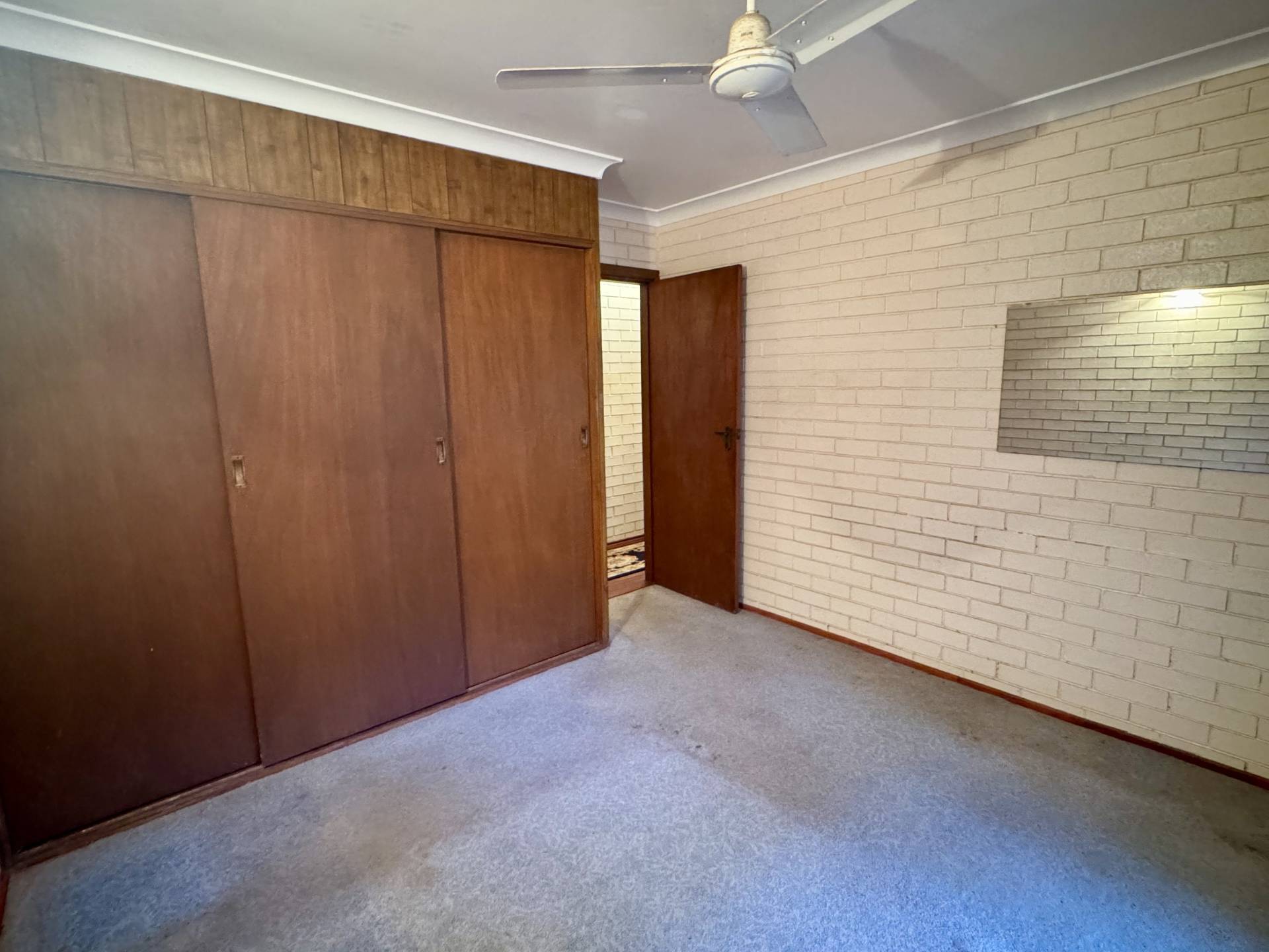 Both bedrooms include wardrobes and ceiling fans, with a central bathroom, separate laundry, and even a walk-in storage closet for added practicality.