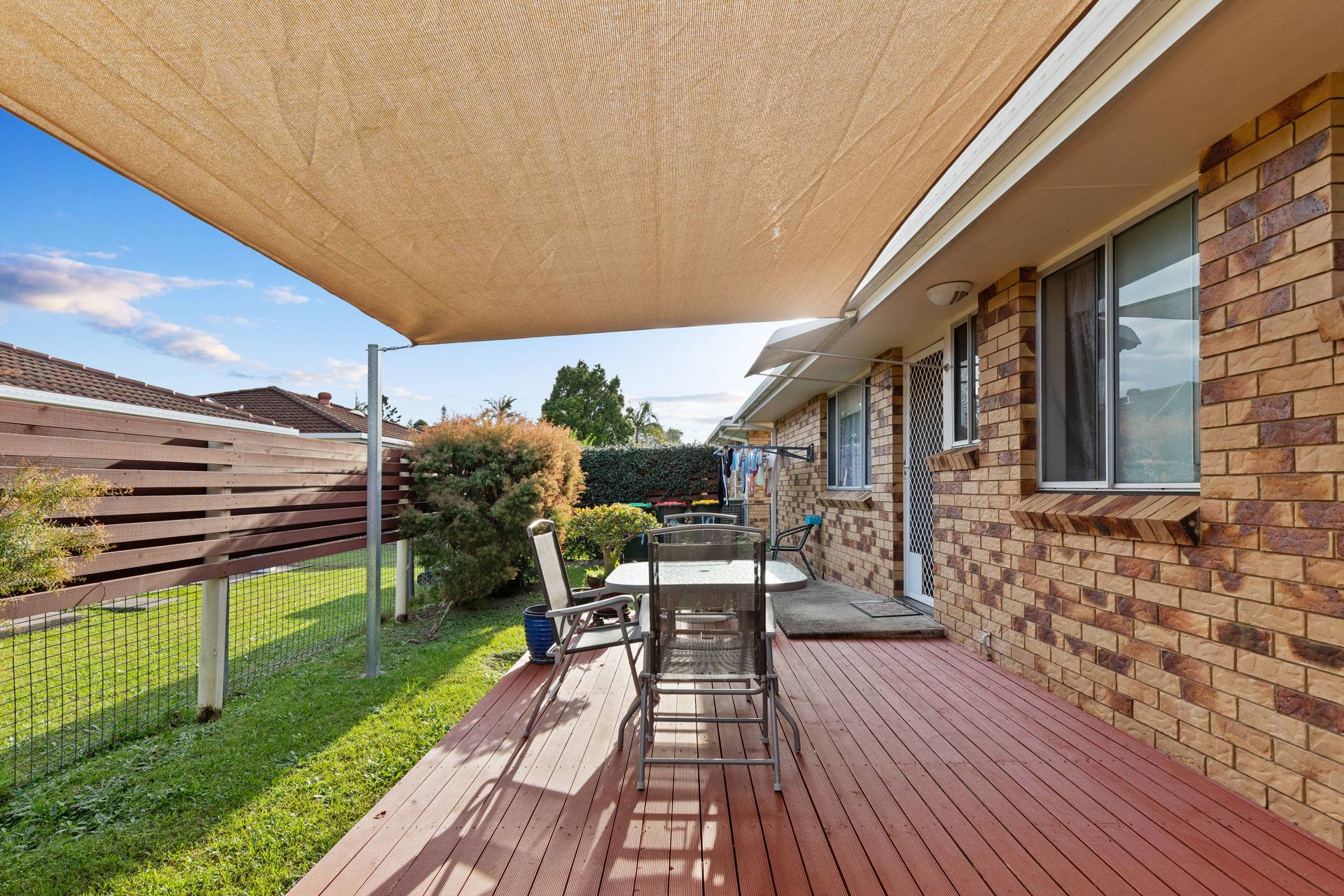A large timber deck and shade sail for sunny cups of tea, or relaxing with a glass of wine.